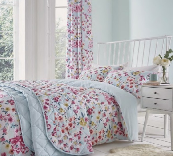 Patchwork squares of summer blossoms with a soft duck egg polka dot reverse. Easy care Polycotton blend